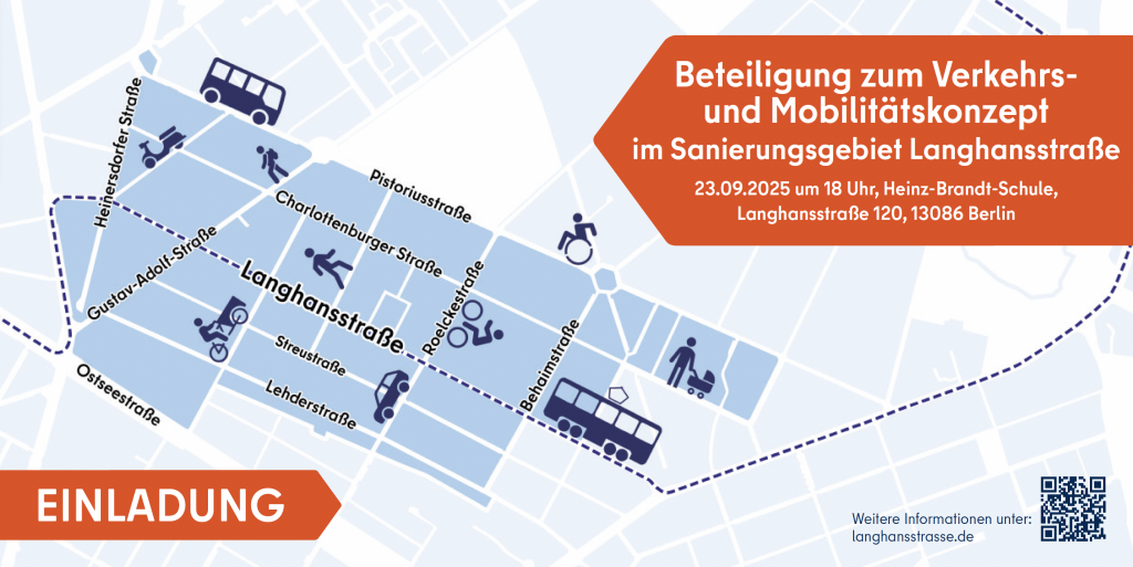 Aktuell wird auf Grundlage der Ergebnisse der Verkehrszählungen und Verkehrsbeobachtungen ein erster Entwurf für das Verkehrs- und Mobilitätskonzept Langhansstraße erarbeitet. Weitere Termine zur Information und Beteiligung werden im Stadtteilladen (Jacobsohnstraße 21) angeboten: